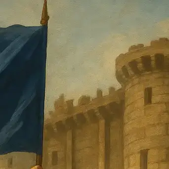 프랑스 혁명 당시 바스티유 감옥 앞에서 시민들이 삼색기를 들고 자유·평등·박애를 외치는 장면의 일러스트